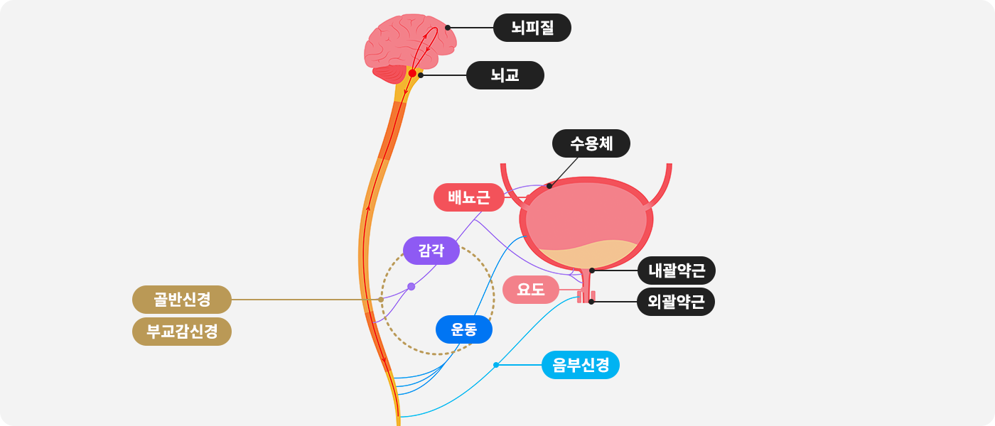 신경인성 하부요로기능장애는 다양한 특징을 가지는 질환군으로 다양한 신경계의 변화로 인해 나타나는 배뇨증상군입니다. 중추신경계 또는 말초신경의 질병으로 인한 방광 및 요도의 기능 장애인 신경인성 하부요로기능장애는 중요한 의학적 및 사회적 문제입니다. 전두엽 뇌 병변, 파킨슨병, 뇌졸중, 다발계 위축증, 치매 등의 뇌간 상부의 질환을 위시하여 척수질환, 척수손상, 다발성경화증, 말초신경질환 등이 원인이 됩니다. 배뇨근의 활동성 장애, 방광 유순 도의 변화, 괄약근의 비정상화, 충전 감각의 이상 등으로 인해 소변의 저장과 배출에 장애를 가져옵니다.