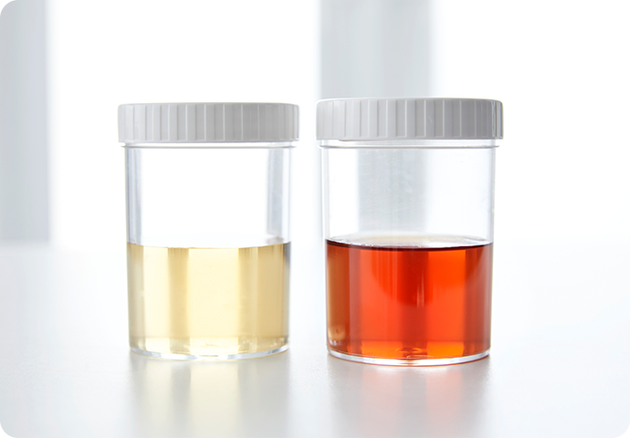 혈뇨는 한 번 나타나더라도 자세한 검사가 필요할 만큼 중요합니다. 눈으로 보이는 육안적 혈뇨와 실험실 검사에서 보이는 현미경적 혈뇨로 나누어지고 후자의 경우라도 1/3 이상에서 원인이 밝혀지는데 암도 4%까지 진단된다고 보고되고 있습니다. 주원인은 신장, 방광의 악성종양이나 결석, 감염, 손상 등이 있습니다. 통증이나 핏덩이가 동반되는지 방광 자극 증상이 있는지 배뇨 시 처음부터 끝까지 있는지 등은 진단에 중요한 단초를 제공합니다. 색소가 들어 있는 음식물을 섭취했거나 출혈 증후군으로 인한 혈색소뇨증이 있으면 소변이 붉게 나올 수도 있습니다. 소변검사와 요세포검사, 종양표지자 검사 등과 함께 초음파나 CT 검사, 방광경 검사를 시행합니다.